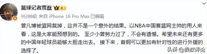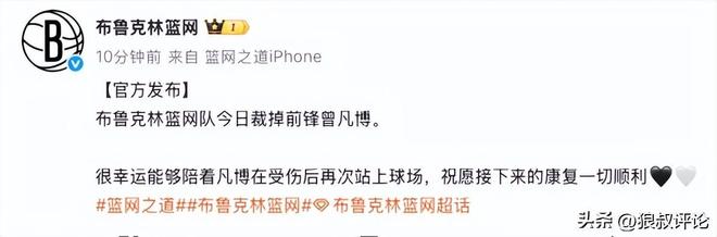 篮球记者贾磊发文点评:曾凡博被篮网裁掉,这并不是一个意外的结果。以NBA中国赛篮网主帅的用人来看,这是大家能预想到的。 至少小曾努力过了,不会有遗憾。