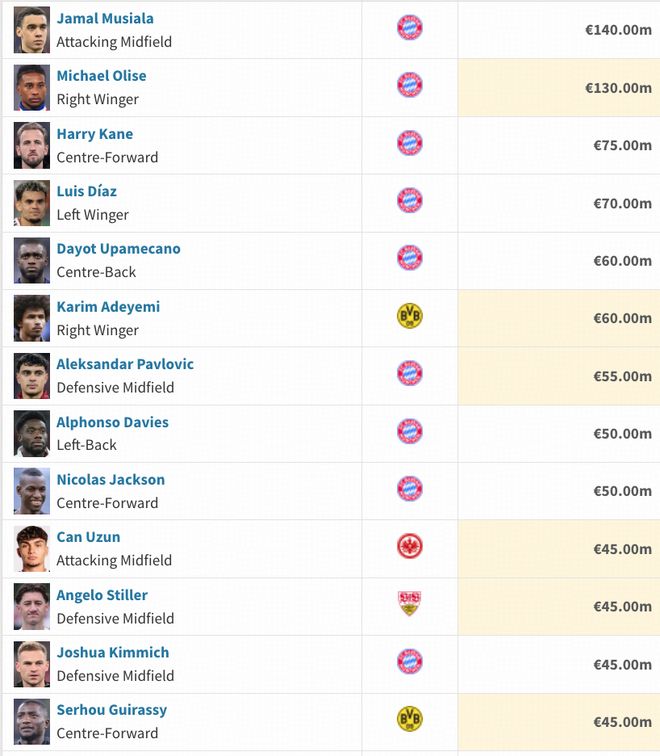 德甲身价更新:奥利塞暴涨3000万至1.3亿欧,穆西亚拉1.4亿欧仍居首